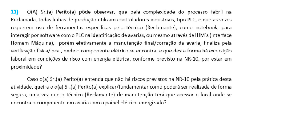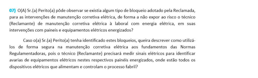 São perguntas com uma fundamentação técnica robusta, o que exigirá do perito judicial um conhecimento profundo das atividades desempenhadas pelo Cliente do Advogado(a). As respostas deverão ser embasadas nos princípios técnicos, nos respectivos enquadramentos das Normas Regulamentadoras do MTE (Ministério do Trabalho e Emprego) e ambientes industriais nocivos.